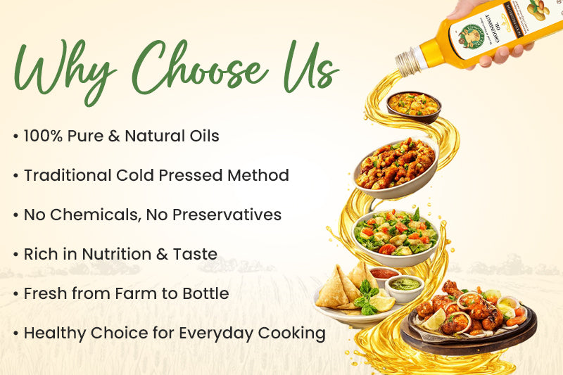 We use the traditional Kachi Ghani method to cold-press oils at low temperatures, preserving their natural nutrients, aroma, and purity. This slow, chemical-free process ensures you get the freshest and most authentic oil — just as nature intended.