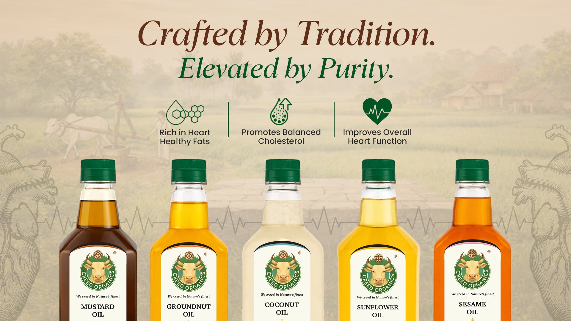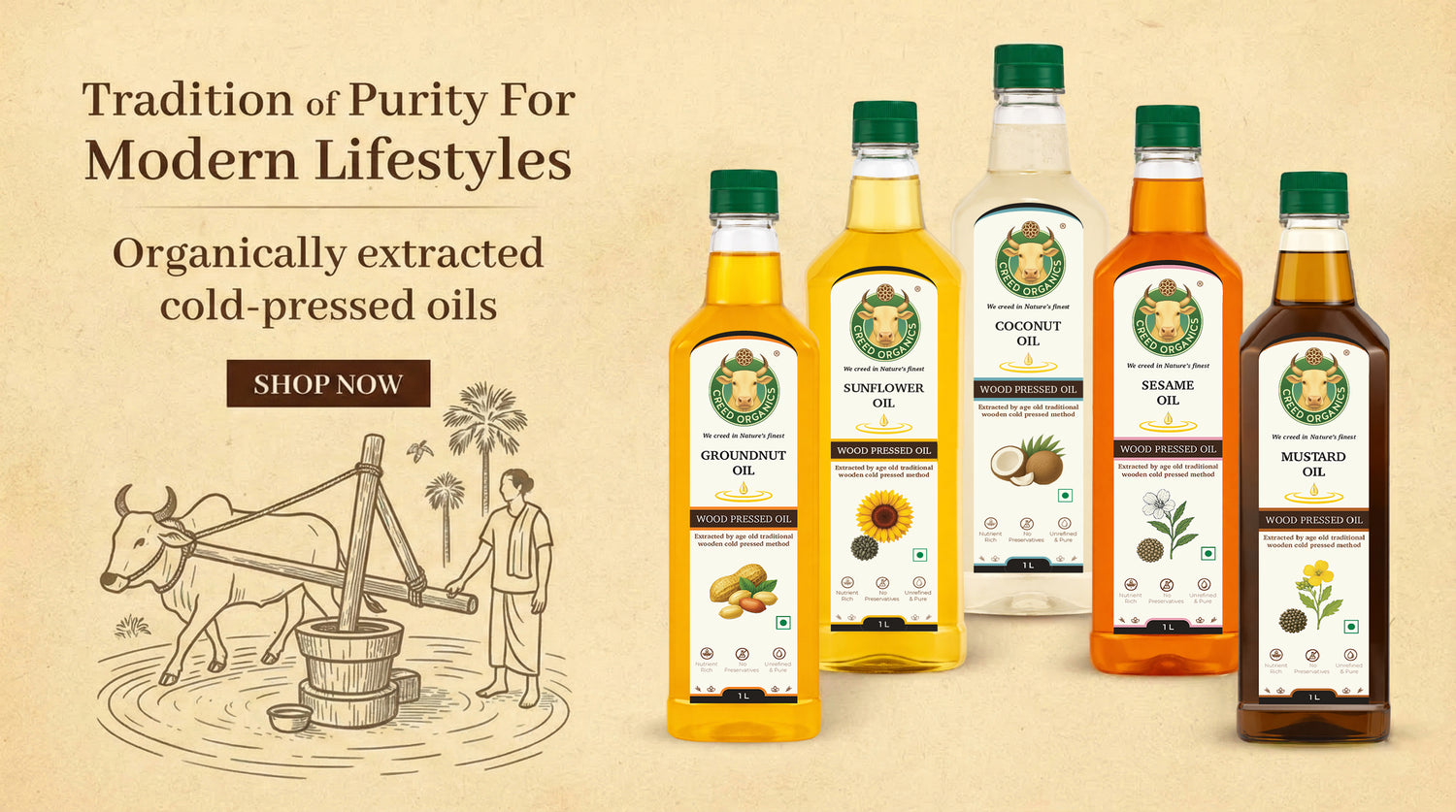 At Creed Organics, we unite timeless Indian wisdom with modern integrity—slowly pressed, crafted, and untouched by chemicals. Every bottle is a commitment to the soil, to tradition, and to your wellbeing. We creed in nature’s finest.